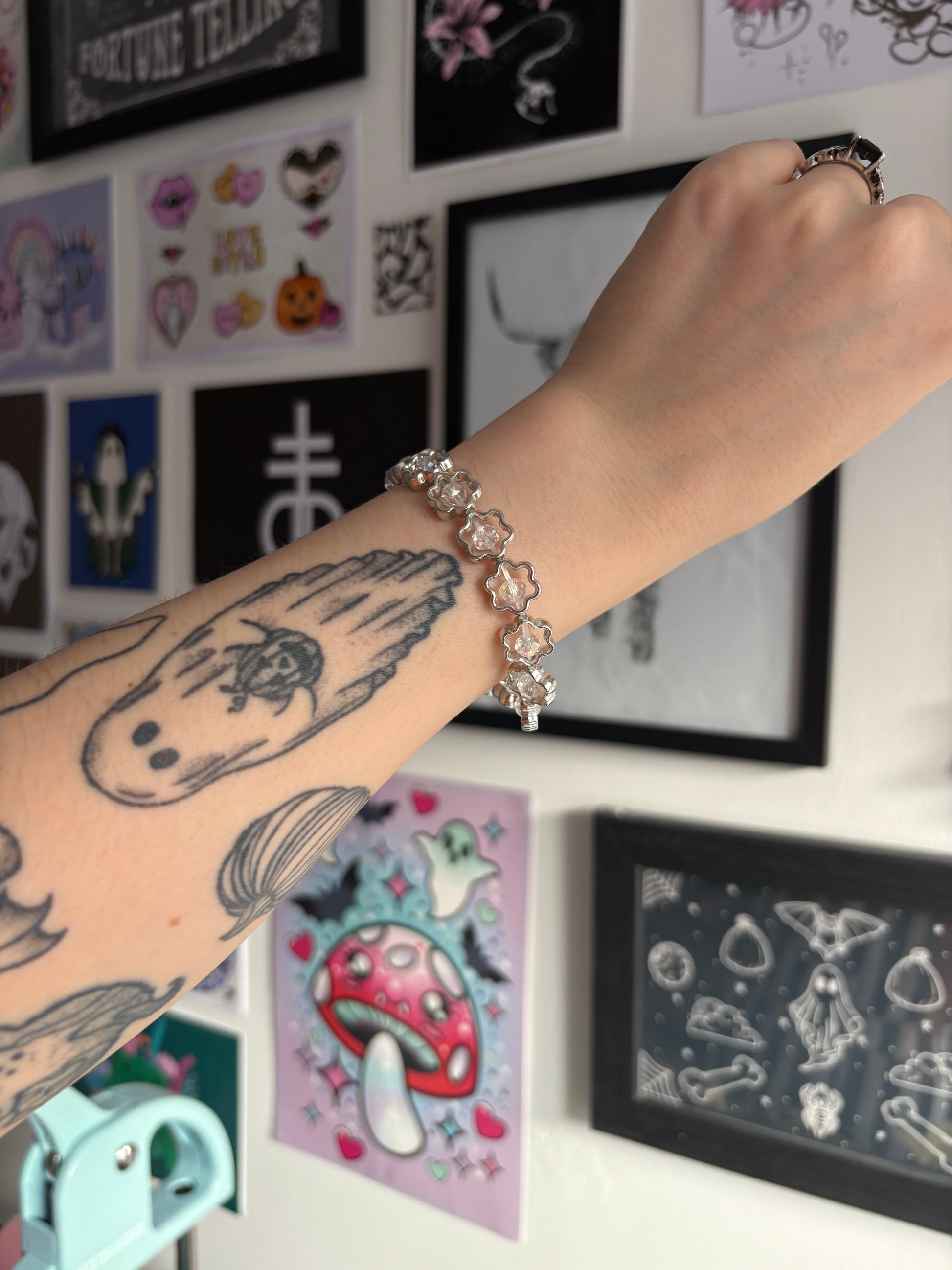 Adorable silver flowers beaded bracelet! Made using acrylic beads.